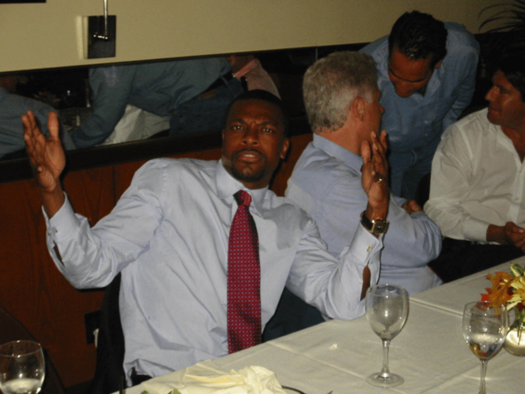 Ghislaine Maxwell und Chris Tucker auf einem teilweise geschwärzten Foto.